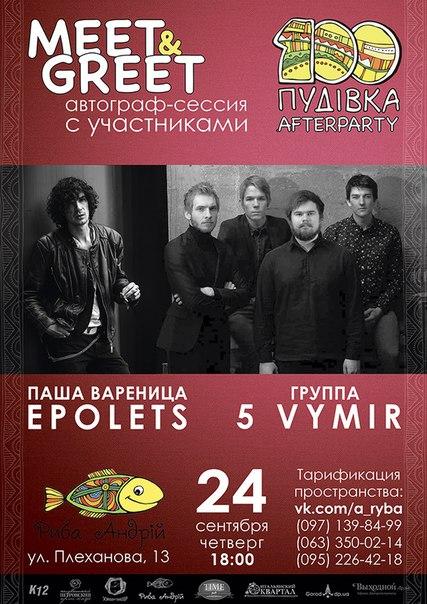 А сразу после MEET & GREET в 19:00 в POPLAVOK Music Hall празднуем завершение восхитительного фестивального сезона-2015 и снова погружаемся в атмосферу свежей украинской музыки с одними из участников фестиваля СТОПУДОВКА: EPOLETS, НАТОЛIЧ и 5 VYMIR.