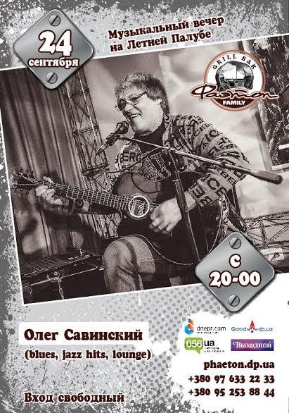 В четверг, 24 июня, Вы услышите знакомые мотивы в исполнении Гостя сцены Фаэтона! Яркий и харизматичный Олег Савинский (вокалист и музыкант группы 3ton-acoustic). Вас угостят романтическими музыкальными композициями.