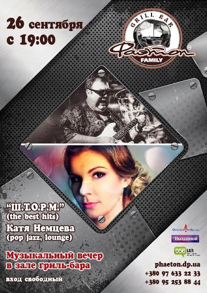 В теплый вечер субботы, 26 сентября, приглашаем Вас с семьей, родными и близкими хорошо провести время в уютной, дружной и почти домашней атмосфере. Чистый, качественный и приятный живой звук скрасит Ваш вечер и сделает его незабываемым! Весь вечер на сцене для Вас играют и поют вокалист – Екатерина Немцева и группа Ш.Т.О.Р.М..