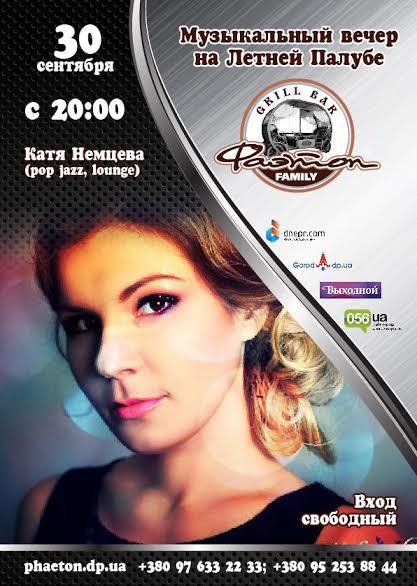 Приглашаем провести последний день сентября в гриль-баре Фаэтон! Весь весь вечер украшает и дарит Вам приятные эмоции своим завораживающим, приятным и манящим вокалом – Екатерина Немцева. Музыка в стиле lounge, pop jazz, cover hits, soul.