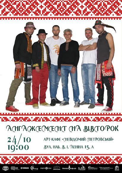 Що має містити в собі українська музика? Це питання відходить на другий план, коли вони виходять на сцену. Потужна сила повної Українізації охоплює усе навколишне середовище, їх драйв має чарівну дію, відкриває в людях нестримне бажання гемселитись і стрибати до стелі. ‘Ангажемент на вівторок’ – фольк-рок гурт з ближнього Павлограда, це раз концерт має бути на підтримку ЕР альбома ‘ВОЛОНТЕР’, який хлопці представили суспільству ще влітку, та презентувати його концертом так і не сталося, тому не втрачаючи можливості музиканти прямують у Дніпропетровськ і везуть подарункові СD. На жаль кількість дискiв обмежена, але не обмежено одне, це море драйву!!!)))