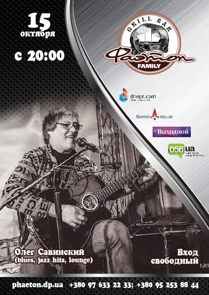 15 октября, в четверг, на сцене нашего гриль-бара постанет харизматичный и оворажительный Олег Савинский, руководитель известной группы Днепропетровска 3ton-acoustic.Репертуар Олега Савинского разнообразен и придется к слуху, наверное, каждого нашего Гостя, поэтому с уверенностью скажем, что мы Вам угодим!