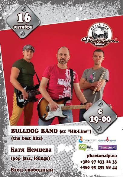 Пятница, 16 октября, будет заполнена только яркими эмоциями каждого нашего Гостя. Вечер, когда можно расслабиться, отдохнуть, и позволить себе выпить чего-то горячительного, разрядивши трудовые будни. Ну и конечно, же помогут нам в этом, уже полюбившиеся многим Гости из г.Днепродзержинска, трио Bulldog Band (ex Hit-Line) в тандеме с завораживающей Екатериной Немцевой. Для Вас прозвучат известные мотивы таких мировых талантов, как Chris Rea, Eric Clapton, Lenny Kravitz, the Beatles, Pink Floyd, Joe Cocker, Bob Marley и множество других. Расслабтесь с удовольствием в самом необычном Фаэтоне нашего города.