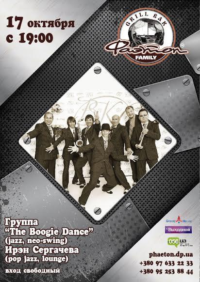 17 октяюря, в субботу, гриль-бар гарантирует непередаваемые впечатления и эмоции. Фаэтон с радостью представляет Вам своих новых Гостей виртуозы американского джаза и нео-свинга, харизматичные и неутолимые – the Boogie Dance! Неувядаемые выступления классических джазовых стандартов – Minnie The Moocher, Mack The Knife, Up A Lazy River, произведения ярчайших представителей сцены эпохи Neo-Swing The Brian Setzer Orchestra, Big Bad Voodoo Daddy, Squirrel Nut Zippers. Атмосфера тепла и необычайности сведет Вас с ума! Ощутите это с нами!