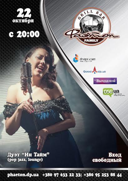 Вечером, 22 октября, с осенним настроением и задором Вас ждет у себя гостеприимный ‘Фаэтон’. Весь вечер для Вас будут петь и играть зачаровывающий дуэт ‘Ин Тайм’. Будут исполнены для Вас лучшие, популярные и не угасающие композиции. Приходите, не пожалеете!