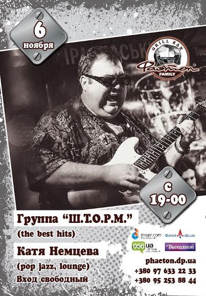 В прекрасный долгожданный вечер пятницы, 6 ноября, приглашаем Вас с семьей, родными и близкими хорошо провести время в уютной, дружной и почти домашней атмосфере. Чистый и качественный живой звук скрасит Ваш вечер сделав его незабываемым! Весь вечер на сцене для Вас играют и поют вокалист – Екатерина Немцева и группа Ш.Т.О.Р.М..