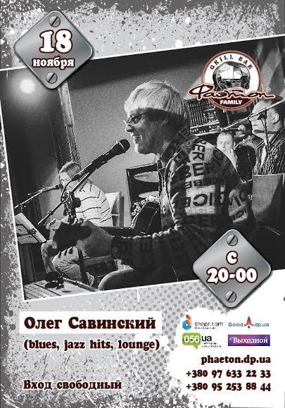 18 ноября, в среду, на сцене нашего гриль-бара постанет харизматичный и обворажительный Олег Савинский, руководитель известной группы Днепропетровска 3ton-acoustic.Репертуар Олега Савинского разнообразен и придется к слуху, наверное, каждого нашего Гостя, поэтому с уверенностью скажем, что мы Вам угодим!