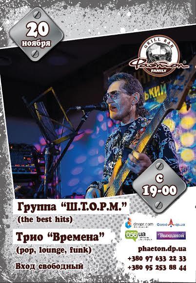 В осенний вечер пятницы, 20 ноября, приглашаем Вас с семьей, родными и близкими хорошо провести время в уютной, дружной и почти домашней атмосфере. Чистый, задорный, качественный и музыкально – проверенный временем живой звук скрасит Ваш вечер и сделает его незабываемым! Весь вечер на сцене для Вас играют и поют трио Времена и группа Ш.Т.О.Р.М..