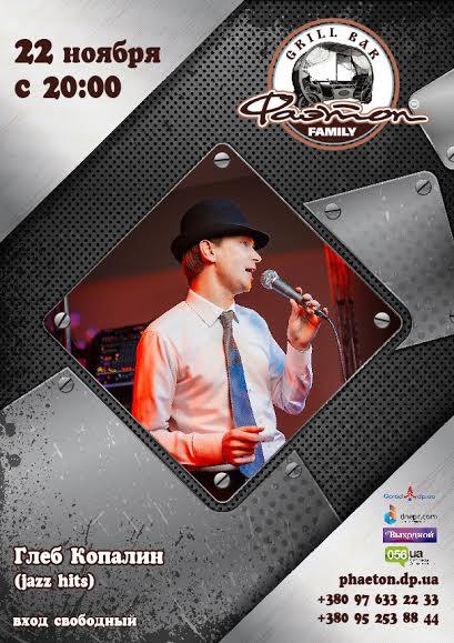 В воскресенье, 22 ноября, Гриль-бар Фаэтон с открытыми дверьми приглашает Вас на вечер артистичного и выразительного Глеба Копалина! Насыщенные jazz- и swing-композиции подарят Вам удовольствие от услышанного и увиденного! Погружайся в атмосферу тепла, комфорта и уюта вместе с гриль-баром Фаэтон.