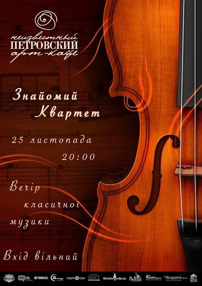 ‘Невідомий Петровский’ піклується про твоє музичне самопочуття! Приходь о восьмій годині по глінтвейн та відчуй себе у епосі аристократичного міста разом із ‘Знайомим квартетом’