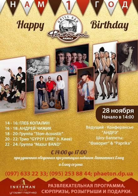 В феерическую праздничную субботу – 28 ноября, гостеприимный ‘Фаэтон’ встречает Гостей по-особенному! Повод – День Рождения, гриль-бару ‘Фаэтон’ исполняется 1 год! Этот день будет насыщен яркими эмоциями, удивлениями, приятными сюрпризами, подарками, розыгрышами и кучей развлечений!