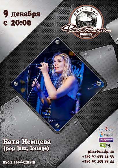 В прекрасный вечер трудовой среды, 9 декабря, приглашаем Вас с семьей, родными и близкими хорошо провести время в уютной, дружной и почти домашней атмосфере. Чистый, качественный и приятный живой звук скрасит Ваш вечер и сделает его незабываемым! Весь вечер на сцене Фаэтона для Вас будет выступать и наслаждать удовольствием от услышанного – Екатерина Немцева.