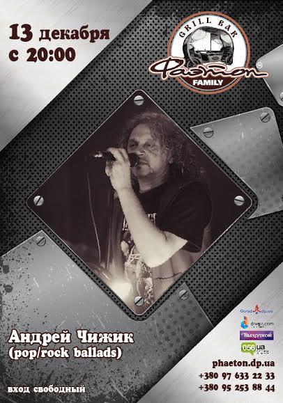 13 декабря, в воскресенье, подсластить Ваш прекрасный вечер со сцены Фаэтона сможет вокал нашего настоящего и артистичного Гостя Андрея Чижика! Удовольствие от приятных pop- и rock-ballads, приятная и теплая, почти домашняя атмосфера, вкусная кухня и только истинные традиции… все это ждет Вас в воскресенье в нашем самом необычном гриль-баре в городе…