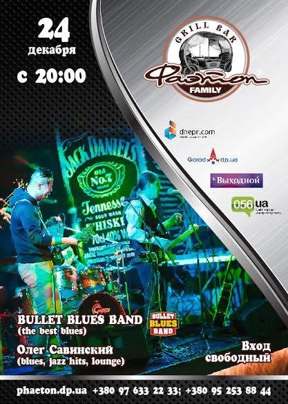 энд! До 30 декабря, каждый день, Вас ждет настоящий и вкусный музыкальный отрыв! Вы насладитесь множеством лучших хитов всех времен и народов. Ну а начинем мы с ярких и эффектных блюзовых виртуозов – BULLET BLUES BAND. В тандеме с ними выступит наш друг и так же любимец публики Олег Савинский. Все это – только начало, отмечайте все праздники в лучших традициях и в атмосфере тепла Фаэтона.