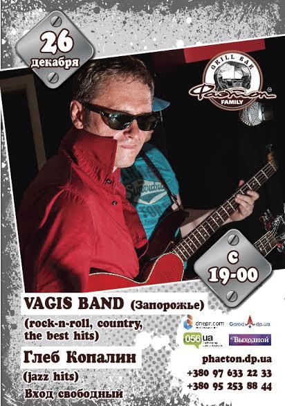 Суббота, 26 декабря, будет очень яркой, и для тех, у кого не вышло побывать у нас в прошлую субботу, мы специально повторим этот отрыв и этот рок-н-ролльный манер! Гости из г. Запорожья желают удивить Вас вновь! Итак, на сцене гриль-бара виртуозы, даже мы сказали бы, фанатики своего дела яркие и неутомимые VAGIS BAND. В тандеме с нашим любимцем публики Глебом Копалиным, музыканты подарят Вам вечер настоящего наслаждения и отдыха!