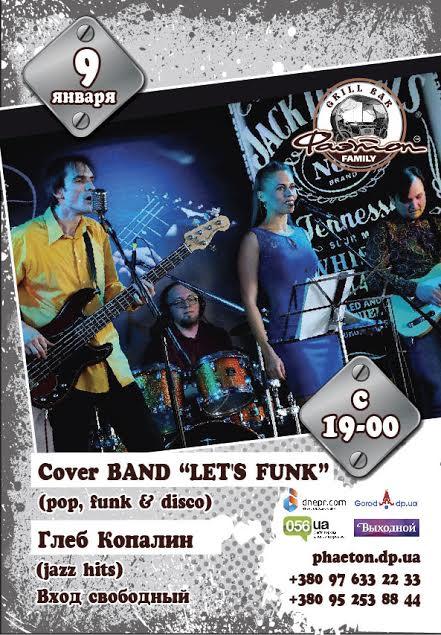 Мы продолжаем с удовольствием проводить каждый свой выходной и в субботу, 9 января, конечно же, порадуем Вас хорошими нотами и музыкальными композициями! Сцена гриль-бара будет заполнена яркими и неутомимыми музыкантами –Cover BAND Let’s FUNK! Для Вас прозвучат лучшие хиты, проверенные временем, но это еще не все – незабываемое впечатление проходящего вечера обеспечит и поддержит наш яркий и антуражный вокалист jazz и neo-swing музыки Глеб Копалин.