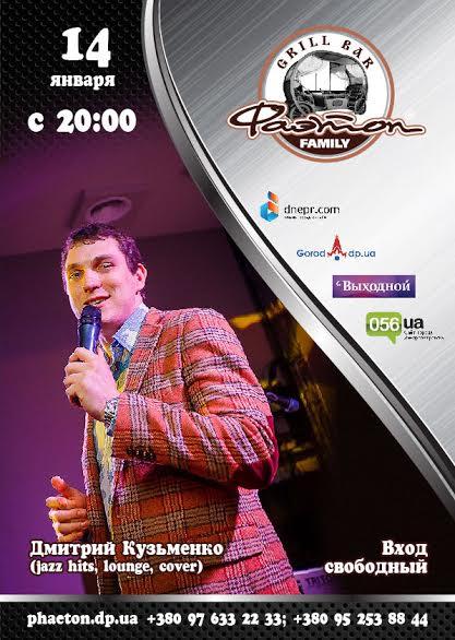 В четверг, 14 января, приглашаем Вас провести вечер с яркими эмоциями, на сцене гриль-бара обворожительный и харизматичный Гость из гю.Харькова и друг Фаэтона Дмитрий Кузьменко.