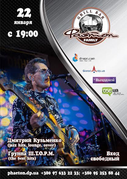 22 января, в пятницу, гриль-бар Фаэтон приглашает встретить начало выходных яркими эмоциями! Весь вечер со сцены Фаэтона для Вас будут звучать настоящие и незабываемые вещи в стилях pop, funk & the best hits от эффектных Creative Band Funky Fresh, в тандеме с харизматичным и обаятельным вокальным Гостем и другом Фаэтона Дмитрием Кузьменко музыканты подарят Вам вечер настоящего отдыха и наслаждения.