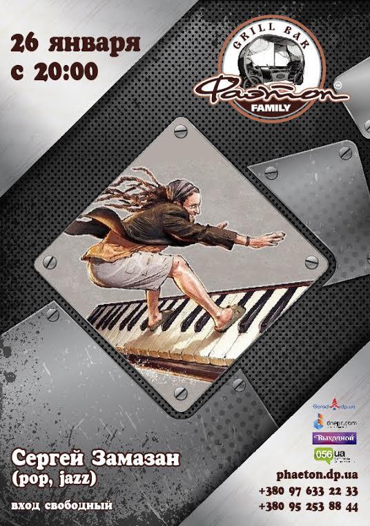 Последний вечер вторника, 26 января вовсе необязательно проводить дома! У нас тепло, уютно и мы ждем Вас! Гриль-бар Фаэтон приглашает всех Гостей на расслабляющий музыкой вечер! Гостя сцены Сергей Замазан. Исполнения на клавишной гармонике Вас приятно удивят!