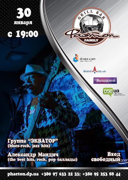 30 января, в субботу, гриль-бар приглашает в Гости и гарантирует непередаваемые впечатления и эмоции. Фаэтон с радостью представляет Вам Гостей виртуозов поп/рок- музыки, харизматичных и неутолимых группа Экватор! А так же разогреет и поддержит атмосферу комфорта приятный вокальный подарок от нашего Гостя Александра Мандича! Атмосфера уюта и комфорта уже ждет Вас в самом необычном гриль-баре в городе!
