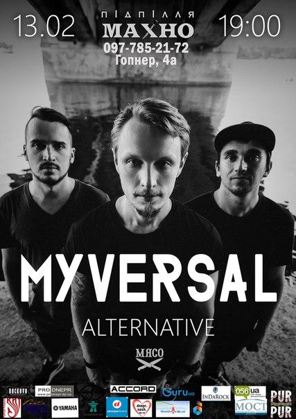 MYVERSAL – совсем необычная группа, которая объединяет в себе нежность и искренность, переходящую в безудержный драйв и прокачи! Уже в эту субботу, на самой горячей площадке Днепропетровска, на самой неистовой рок-тусовке, ровно в 19:00! Успей купить билеты!
