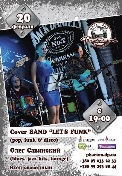 В субботу, 20 февраля, ждем Вас в гостеприимном гриль-баре Фаэтон!Сфеерическими и зажигательными композициями, с заводными манерами и тактами сцена гриль-бара встречает всех Гостей в лицах неутомимых Cover BAND Let’s Funk. В тандеме с эффектным ОлегомСавинским, музыканты подарят Вам прекрасное настроение в этот субботний вечер! Наслаждайтесь необычностью в самом необычном гриль-баре в городе…