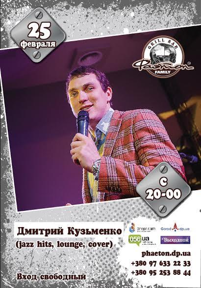 В четверг, 25 февраля, приглашаем Вас провести вечер с яркими эмоциями, на сцене гриль-бара обворожительный Гость из г.Харькова и друг заведения Дмитрий Кузьменко. Ждем Вас большой компанией с друзьями, родными и близки! Вкусные блюда на гриле прямо в центре зала, фирменное разливное пиво Фаэтон, заводное настроение и теплая и уютная атмосфера все это ждет Вас в этот вечер в гриль-баре. Ждем в Гости!