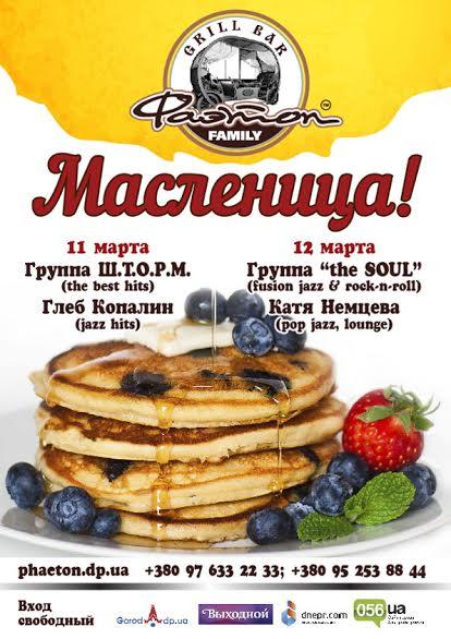 Приглашаем всех на веселую встречу весенней поры Масленицу. Главными атрибутами праздника являются гулянья, веселья и, конечно же, блины, поскольку они являли собой символ солнца, которое все ярче разгорается, удлиняя дни. Именно по этому поводу гриль-бар Фаэтон порадует Вас блинами с начинками на любой вкус: говядина, треска, овощи гриль, заварной крем, бананы, яблоки, шоколад и творог.