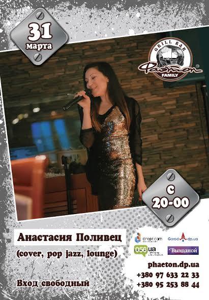 В воскресенье, 31 марта, ждем Вас с семьей, родными и близкими хорошо провести время в уютной, дружной и почти домашней атмосфере гостеприимного Фаэтона. Весь вечер со сцены Фаэтона Вас будет радовать своим вокалом Анастасия Поливец.