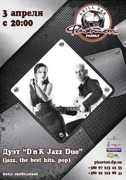 Теплым вечером, 3 апреля, с весенним настроением и задором Вас ждет у себя гостеприимный ‘Фаэтон’. Весь вечер для Вас будут петь и играть зачаровывающий джазовыйдуэт ‘D’n’K Jazz Duo’. Для Вас будут исполнены лучшие, популярные и не угасающие композиции джазовой эпохи. Приходите, не пожалеете!
