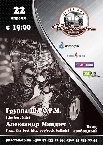 В теплый пятничный апрельский вечер, 22 числа, сцена Фаэтона вовсю порадует любителей хорошей и вкусной музыки. Лучшие хиты, интересные авторские подачи и харизма наших Гостей группы Ш.Т.О.Р.М. в тандеме с Александром Мандичем будет радовать и удивлять Вас на протяжении своего вечера. Ну, а кухня ‘Фаэтона’, конечно же, ждет своих почитателей – пикантные блюда на гриле, ароматные овощи-гриль, авторские подачи от нашего шеф-повара и гастрономическое удовольствие от увиденного и опробованного. Придите и ощутите это с нами!