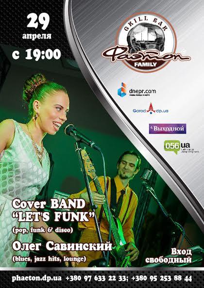В весенний вечер пятницы, 29 апреля, приглашаем Вас с семьей, родными и близкими хорошо провести время в уютной, дружной и почти домашней атмосфере. Чистый, задорный, качественный и музыкально – отрывной живой звук подсластит Ваш вечер и сделает его незабываемым! Весь вечер на сцене зажигательный funk от наших Гостей сцены Cover BAND Let’s FUNK, а так же приятный вокал нашего от постоянного Гостя – Олега Савинского (вокалист группы 3ton-Acoustic).