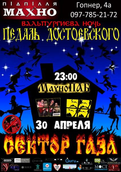 В ночь с 30 апреля на 1 мая наступает тот самый день, когда все нормальные люди пытаются всеми возможными методами от нечести, ведьм и прочей чертовщины&hellip,. Но как оказалось все, кроме Махно Паба, ведь они позвали нас играть в эту ночь для Вас :). Как поется в песне группы Сектор Газа: &hellip,а в полдень инквизиторы нас кинут на костры&hellip,, никто никого кидать не в какой костер не будет) гореть мы на самом то деле собираемся, да так, что бы в аду черти нам завидовали, но возгорание предлагаем начать, продолжить и закончить исключительно внутреннее, при помощи горячительных напитков. В этот вечер мы не можем обойти стороной и песни Юры Хоя про ведьм, вампиров и тд, поэтому решили подготовить для Вас несколько новых и веселых песен про нечисть 🙂 В общем, приходите и угорите с нами, выпустите всех своих демонов, пусть в эту ночь они оторвутся по по-полной программе, а мы этому немного поспособствуем. Ваши Педали).