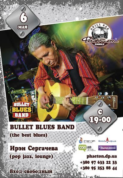 В теплый вечер пятницы, 6 мая, приглашаем Вас с семьей, родными и близкими хорошо провести время в уютной, дружной и почти домашней атмосфере. Чистый, качественный и приятный живой звук скрасит Ваш вечер и сделает его незабываемым! Весь вечер на сцене для Вас играют и поют вокалист – Ирэн Сергачева и группа BULLET BLUES BAND.