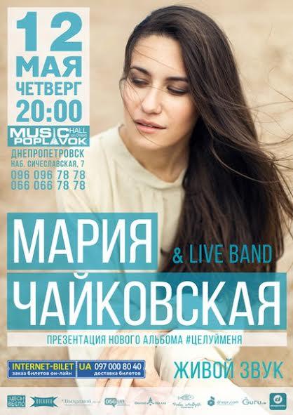 Мария Чайковская с презентацией нового альбома #Целуйменя. Тонкая и завораживающая музыка, пропитанная чувственной лирикой, в сочетании с прекрасным вокалом не оставит равнодушным даже самого искушенного слушателя. В Днепропетровске Мария выступит со своей группой, и кроме песен с нового альбома будут исполнены более ранние хиты.
