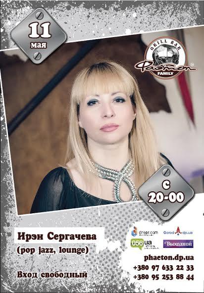 В среду, 11 мая, приглашаем Вас послушать настоящую вкусную музыку в Фаэтоне. Радует и удивляет Вас своим вокалом уже известная многим Ирэн Сергачева. Всегда Вам рады в самом необычном гриль-баре в городе…