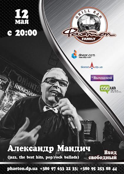 В теплый четверг мая, 12 числа, приглашаем Вас на уютный, почти домашний вечер гостеприимного Фаэтона! В дружной компании, с друзьями, родными и близкими, с сытным столом и наполненными кружками фирменного пива Фаэтон Вы проведете прекрасный вечер в ярких эмоциях и незабываемых впечатлениях. Музыкальную наслаждающую атмосферу со сцены гриль-бара обеспечит наш Гость Александр Мандич.