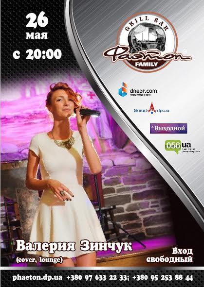 В четверг, 26 мая, приглашаем Вас провести вечер с яркими эмоциями, гастрономическим удовольствием и хорошей вкусной музыкой, на сцене гриль-бара обворожительная Гостья Фаэтона Валерия Зинчук.