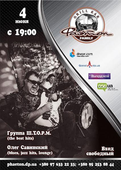 В первый летний субботний вечер, 4 июня, самое время отдохнуть от трудовых будней и побывать у нас Гостях, в гостеприимном гриль-баре. Ярко, дружно, с хорошим настроение, вкусными блюдами, и прекрасной атмосферой ждем Вас в Фаэтоне. Весь вечер со сцены гриль-бара для Вас играют и поют – группа Ш.Т.О.Р.М. и Олег Савинский. Гриль-бар Фаэтон – только истинные традиции!