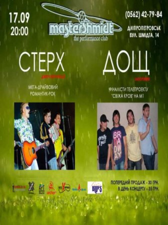 Концерт финалистов телепроэкта ‘Свежая кровь’ на М1 – группы ДОЩ (Запорожье) совместно с мега-драйвовой романтик-рок группой СТЕРХ (Днепропетровск).