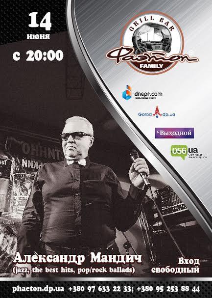 В теплый вторник июня, 14 числа, приглашаем Вас на уютный, почти домашний вечер гостеприимного Фаэтона, пасмурная погода совсем не станет нам помехой. В дружной компании, с друзьями, родными и близкими, с сытным столом и наполненными бокалами Вы проведете прекрасный вечер в ярких эмоциях и незабываемых впечатлениях. Музыкальную наслаждающую атмосферу со сцены гриль-бара обеспечит наш Гость Александр Мандич.