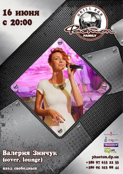Вечером в четверг, 16 июня, Вы непременно должны посетить гриль-бар Фаэтон, летний сезон открыт и мы порадуем Вас теплыми вечерами и, конечно же, прекрасной живой музыкой. Итак, с 20:00 приглашаем Вас послушать настоящий, чистый и проникающий вокал нашей элегантной и удивительной Гостьи Валерии Зинчук. Ее фирменные соло, авторские подачи и исключительно хорошее настроение ждет Вас в этот летний теплый вечер! Ждем Вас в Гости!