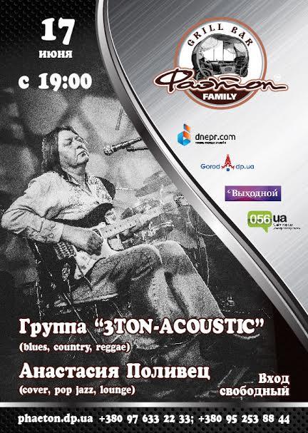 Пятница 17 июня, заиграет композициями в стилях blues, country и reggae и необычно порадует авторскими, фирменным исполнениями и подачами от эффектных виртуозов группы 3ton-Acoustic. Так же, со сцены Летней Палубы подсластить и украсить Ваш вечер поможет нам своим нежным и манящим вокалом Анастасия Поливец!