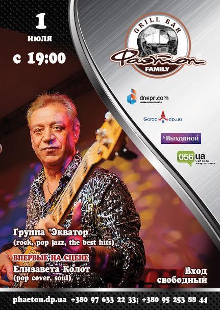 1 июля, в пятницу, гриль-бар приглашает в Гости и гарантирует непередаваемые впечатления и эмоции. Фаэтон с радостью представляет Вам Гостей виртуозов поп/рок- музыки, харизматичных и неутолимых группу Экватор! А так же разогреет и поддержит атмосферу комфорта приятные вокальные сюрпризы от нашей новой Гостьи сцены Елизаветы Колот! Атмосфера уюта и комфорта уже ждет Вас в самом необычном гриль-баре в городе! Ух, суббота, мы ждем тебя!