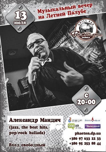В среду, 13 июля, приглашаем Вас на уютный, почти домашний вечер гостеприимного Фаэтона! В дружной компании, с друзьями, родными и близкими, с сытным столом и наполненными кружками фирменного пива Фаэтон Вы проведете прекрасный вечер в ярких эмоциях и незабываемых впечатлениях. Музыкальную наслаждающую атмосферу со сцены гриль-бара обеспечит наш Гость Александр Мандич.