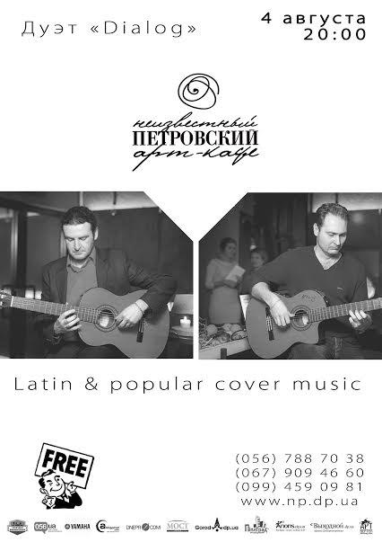 4 августа арт-кафе Неизвестный Петровский приглашает всех на вечер гитарной музыки в исполнении дуэта Dialog. В программе прозвучит латинская музыка, а также кавера на популярные хиты в интересной обработке. Проведите приятный вечер с нами)