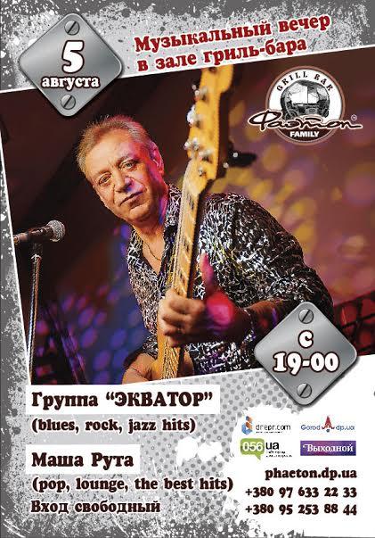 Пятница, 5 августа, порадует Вас живым ритмом – в гостях фееричная группа Экватор. Лучшие поп-, рок-, джаз-хиты, манящая игра саксофона и отличное настроение – все это ждет вас в пятничный вечер в гриль-баре Фаэтон. Но это еще не все приятное впечатление создаст наша Гостья Мария Рута. Лучшие джазовые исполнения, приятный лаундж, теплая, почти домашняя атмосфера, у нас только истинные традиции..
