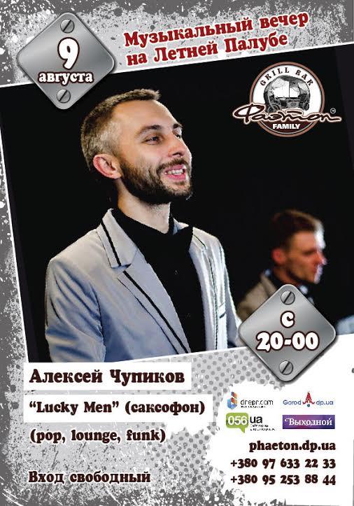 Во вторник, 9 августа, приглашаем Вас послушать хорошую и по-летнему романтическую инструментальную музыку! Радует и удивляет Вас Алексей Чупиков (Lucky Men) и его обворожительное соло на саксофоне. Игра саксофона подарит Вам незабываемое удовольствие! Приходите!
