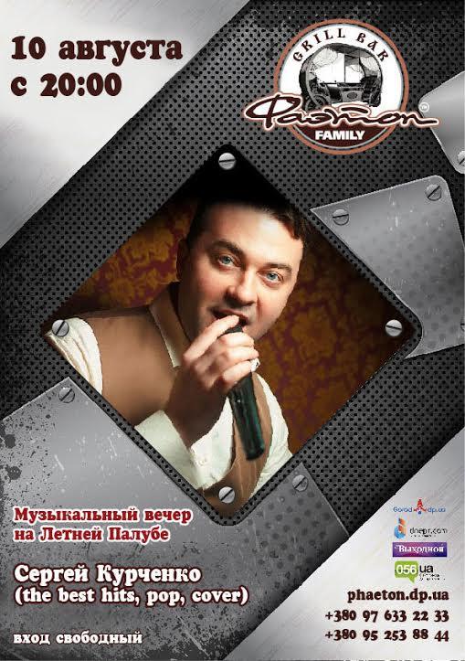 В среду, 10 августа, приглашаем Вас расслабиться и насладиться ярким выступлением со сцены Фаэтона. Традиционно, в Фаэтоне Вас ждет множество вкусных блюд, фирменное не фильтрованное пиво, отличное настроение и музыкальные сюрпризы от нашего Гостя элегантного Сергея Курченко. Приходите и наслаждайтесь!