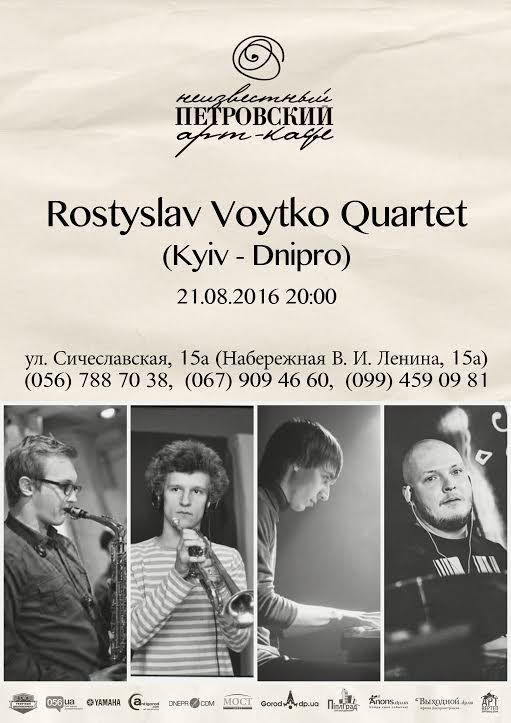 Ростислав Войтко – один из ведущих киевских саксофонистов, активный участник столичной джазовой жизни. Его музыка опирается на традиции таких грейтов джаза как Horace Silver, Hank Mobley, Thelonious Monk, Sonny Rollins, Lennie Tristano, Lee Konitz и многих других, и наполнена своими экспериментами и идеями. Ростислав играл уже со многими музыкантами Украины, а в рамках концерта в ‘Неизвестном Петровском’ Вы услышите авторскую музыку Ростислава, стандарты и собственные аранжировки квартета в составе: